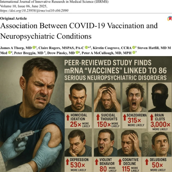 This unprecedented neurological impairment helps to explain why Thorp et al found that mRNA shots were linked to 86 serious neuropsychiatric disorders including dementia, schizophrenia, suicidal and homicidal thoughts, stroke, psychosis, depression, cognitive impairment, delusions, and more:
